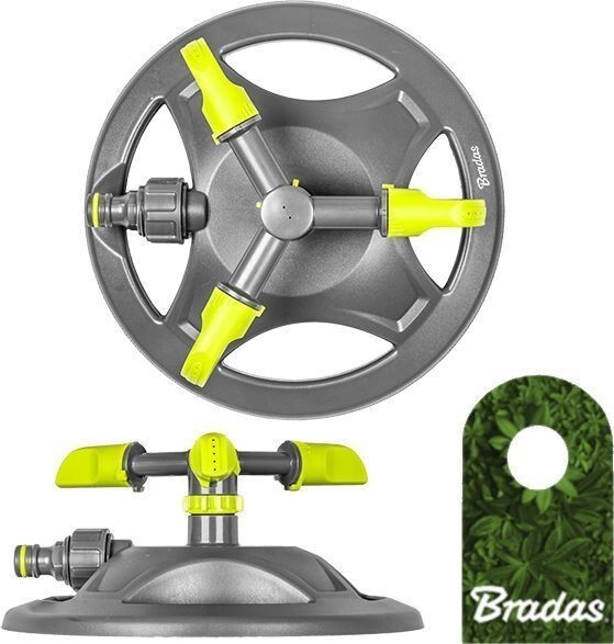 3-ramienny zraszacz obrotowy na podstawie. Każde ramię zraszacz jest regulowane co pozwala na regulacje obszaru zraszania.