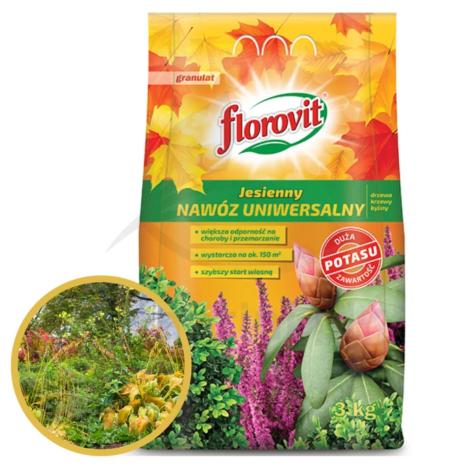 Florovit to uniwersalny nawóz jesienny zawierający wszystkie niezbędne składniki, które zaspokajają zapotrzebowania pokarmowe roślin jesienią. Co ważne, stosowanie nawozu zapewnia lepszy start roślin już od wczesnej wiosny. Korzystnie wpływa on na poprawę kondycji roślin i krzewów oraz na gospodarkę wodną. Sama nazwa „nawóz jesienny” oznacza, że poprzez uzupełnienie składników mineralnych wzmacniamy rośliny przed zmiennymi warunkami atmosferycznymi zimą oraz chronimy je przed chorobami. Preparat można również używać w celu przygotowania podłoża na nowe nasadzenia wiosną.